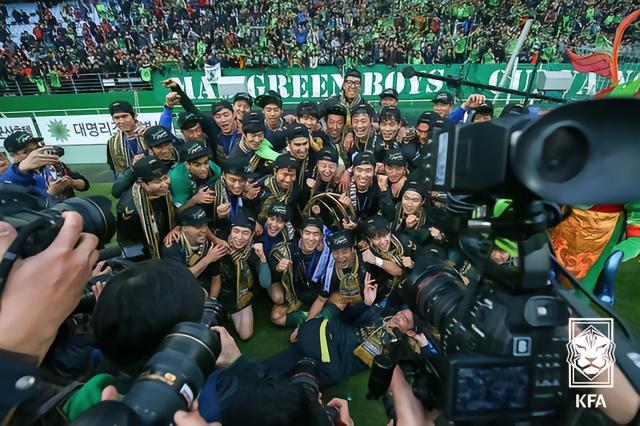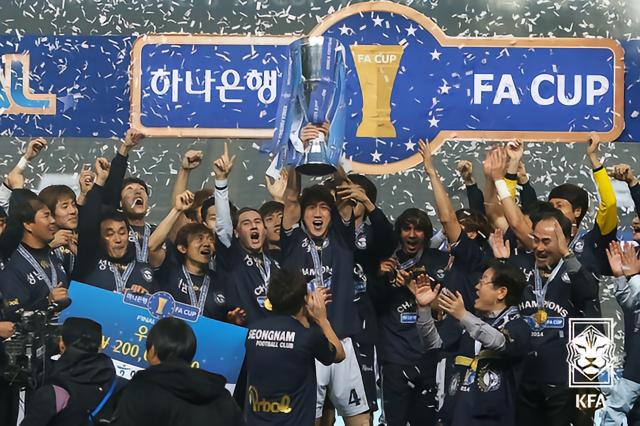 2014年,韩国职业足坛发生了一次巨变。由于统一教撤资足球,韩国昔日的“七星王者”城南一和天马宣布解体,而在城南球迷的请愿下,城南市政府接手了球队,球队也变身市民球队。这一年,城南经历了年初朴钟焕执教的乱局,到后期金鹤范力挽狂澜,率队完成保级,初步完成了目标。但谁也没有想到,这居然是一个开始!2014赛季,城南FC在金鹤范的率领下,杀入了足协杯的半决赛。面对联赛霸主全北现代汽车,金鹤范巧妙与对手周旋,愣是将对手逼入12码决战。结果崔康熙的球队连续2年倒在12码,目送城南FC杀入和FC首尔的决赛。11月23日,韩国足协杯决赛展开争夺,如果FC首尔能够在主场击败城南FC,那么将有可能帮助浦项铁人进入亚冠。但最终的结果,他们输了。在首尔的这场激战,金鹤范再次让球队死守对手120分钟,最终将对手逼入点球大战,最后的12码决战中,城南门神朴俊赫扑出首尔两粒点球,最终帮助球队奇迹夺魁!对于那些质疑城南FC的人们来说,这个冠军就是最好的回击。这张照片就是球队欢庆胜利的场景。
