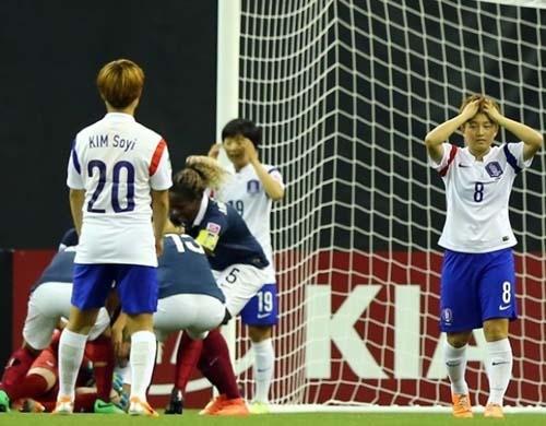 十二码给韩国足球带来的不仅仅有欢笑,也有遗憾。2014年的女足U-20世界杯上,十二码留下遗憾的换成了亚洲冠军韩国女青。2014年8月5日至24日,FIFAU-20女足世界杯在加拿大展开争夺。以亚洲冠军身份出战的韩国女青目标是拿到名次,小组赛她们与尼日利亚、英格兰以及墨西哥同组,韩国女青那届比赛在战平英格兰,次战1-2输给尼日利亚后,生死战凭借李金玟和李炤淡的进球,最终2-1击败墨西哥,以小组第二身份晋级淘汰赛。八强,她们的对手是D组三战全胜的法国女青,这场比赛,外界一致认为韩国女足会在90分钟惨败。但韩国女青却顽强将对手逼入12码,十二码决战中,韩国女青的头号球星张瑟琪和南宫艺智先后射失,而法国则是5中4,最终淘汰韩国晋级。这张照片,记录的就是那场比赛赛后的一个瞬间。