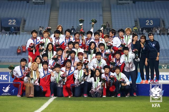 同样是仁川亚运会,韩国女足在尹德汝教练的率领下也开启了征程。9月14日至10月1日,仁川亚运会女足比赛展开争夺,韩国女足和泰国、印度以及马尔代夫同组,结果三场比赛,韩国分别以5-0、10-0和13-0的成绩完美杀入八强。八强战,韩国队以1-0击败中国台北队,晋级半决赛。她们的对手是朝鲜队,只要击败对手,韩国女足就将有可能看到夺冠的希望,而朝鲜女足实力不容小视,她们在八强淘汰了夺冠呼声很大的中国女足。这场与朝鲜女足的半决赛于9月29日在仁川文鹤体育场展开,韩国女足延续了良好势头,第12分钟,头号中锋郑楔槟就完成了领先。但在第36分钟,朝鲜女足就扳平了比分。此后,双方一直互无建树,直到比赛临近结束前,韩国女足的中卫任善株犯下致命失误,她的回传被朝鲜女足前锋断掉,直接射门得分,第93分钟,韩国遭遇了读秒绝杀,赛后姑娘们泪洒赛场。目送朝鲜晋级决赛,而朝鲜女足也不孚众望,决赛3-1将全主力的日本女足击溃,在韩国夺得了亚运会女足项目的金牌。这张照片,就是朝韩两队在赛后领奖后的又一次合影,值得一提的是,去年在韩国的东亚杯,韩国因为帮助朝鲜阻击日本,帮助朝鲜夺冠,两队就产生了深厚的友谊。