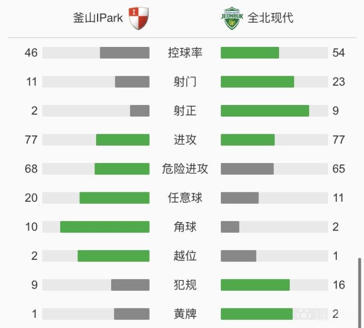 第9分钟,釜山在左路尝试进攻机会,金炳旿的突破造成了金甫炅犯规。第16分钟,全北现代客场取得领先!他们在左路获得了位置不错的任意球机会,洪正好高高跃起头球破门,釜山0-1全北。