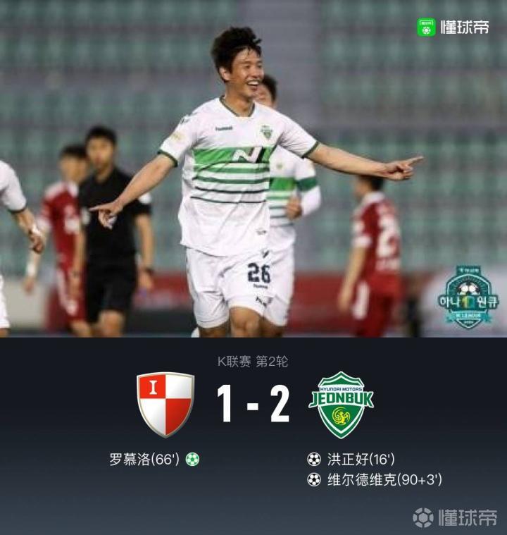 北京时间5月16日18:00,2020赛季K联赛第2轮的比赛,升班马釜山IPark主场迎战全北现代。上半场,全北现代在客场占据优势,洪正好在任意球机会中头球破门,金珍洙、曹圭成也制造威胁,金甫炅错失良机;下半场,金珍洙送点,罗慕洛点射破门,维尔德维克绝杀,釜山1-2全北。