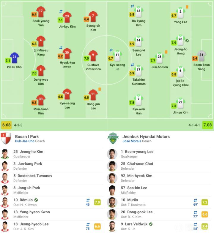 主队釜山IPark方面,崔波秀和金镇圭都获得了全队最高的7.1分;客队全北现代方面,洪正好获得全场最高的7.9分。