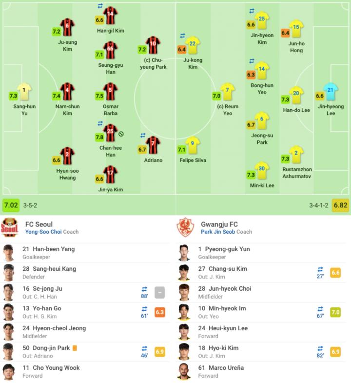主队首尔方面,打入制胜球的韩赞熙获得全场最高的7.8分;客队光州方面,李韩道、李旼气和阿舒尔马托夫都获得全队最高的7.3分。