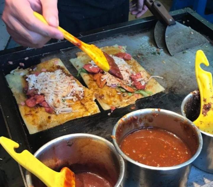 但现在的烤冷面,配料就有鸡蛋、烤肠、牛肉、里脊、培根、鸡柳、洋葱、土豆丝、金针菇、香菜等等。烤冷面配料跟煎饼果子的配料重合度颇高。事实上,做法、性质相似的小吃,往往会共享同样的配料。不得不说,大众的舌头是最好的选票,决定了每一种小吃的现在和未来。