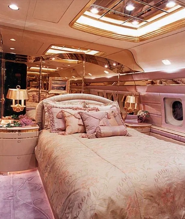 这架飞机内部非常豪华,有一个能够容纳30人的宴会厅,除此之外,飞机上还有厨房、办公室,以及一间拥有双人床的卧室。