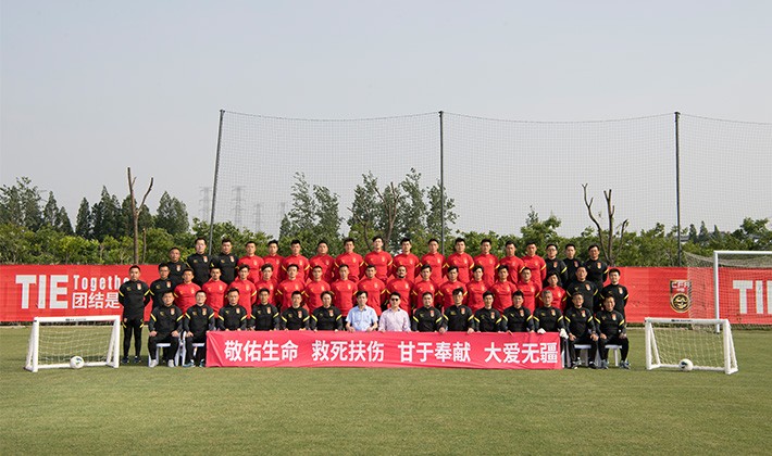 在中国足协主席陈戌源带领下,队伍全体成员打出了“敬佑生命、救死扶伤、甘于奉献、大爱无疆”的横幅标语,向所有疫情防治工作的参与者表达敬意。陈戌源主席、国足主教练李铁向医护人员代表包勤贵赠送了签名球衣和签名球。