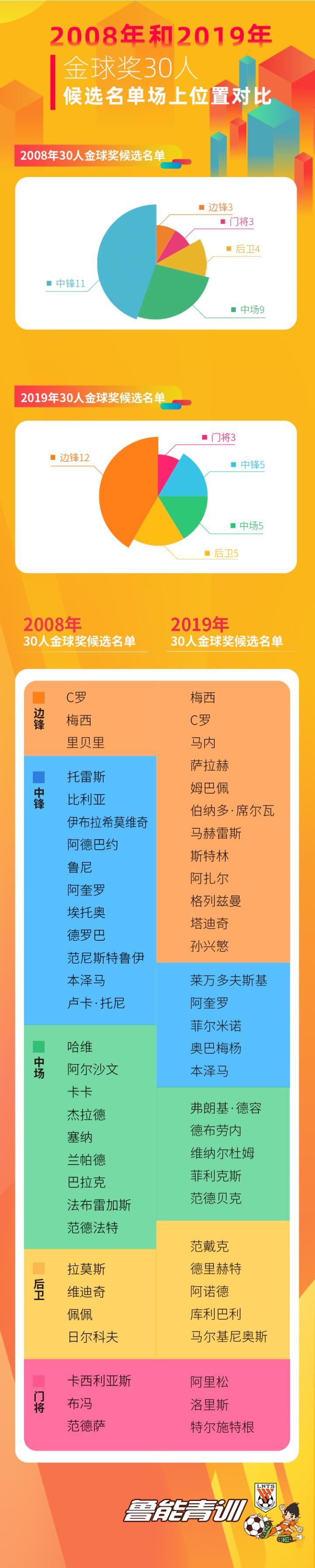 不过,这一切都在2008年开始发生改变。2008年C罗以边锋身份获得自己人生中的第一个金球奖,2019年梅西获得自己的第六座金球奖,在这12年间,梅西和C罗分享了其中的11个金球。但是对比2008年和2019年的金球奖30人候选名单,我们会发现在候选人名单中边锋的数量大大增加,由2008年30人候选名单中的3人变为2019年的12人。下面我们就来探究一下究竟是何原因导致边锋的数量大大增加。