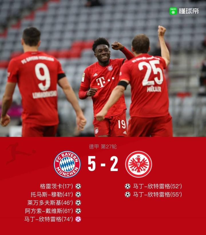 北京时间5月24日0:30,德甲第27轮,拜仁慕尼黑对阵法兰克福。上半场,莱万中楣,格雷茨卡首开记录,穆勒传射,易边再战,莱万闪电扩大领先,欣特雷格梅开二度+自摆乌龙,戴维斯抓住对手后防失误再下一城,科斯蒂奇中柱。最终全场比赛结束,拜仁慕尼黑5-2法兰克福。