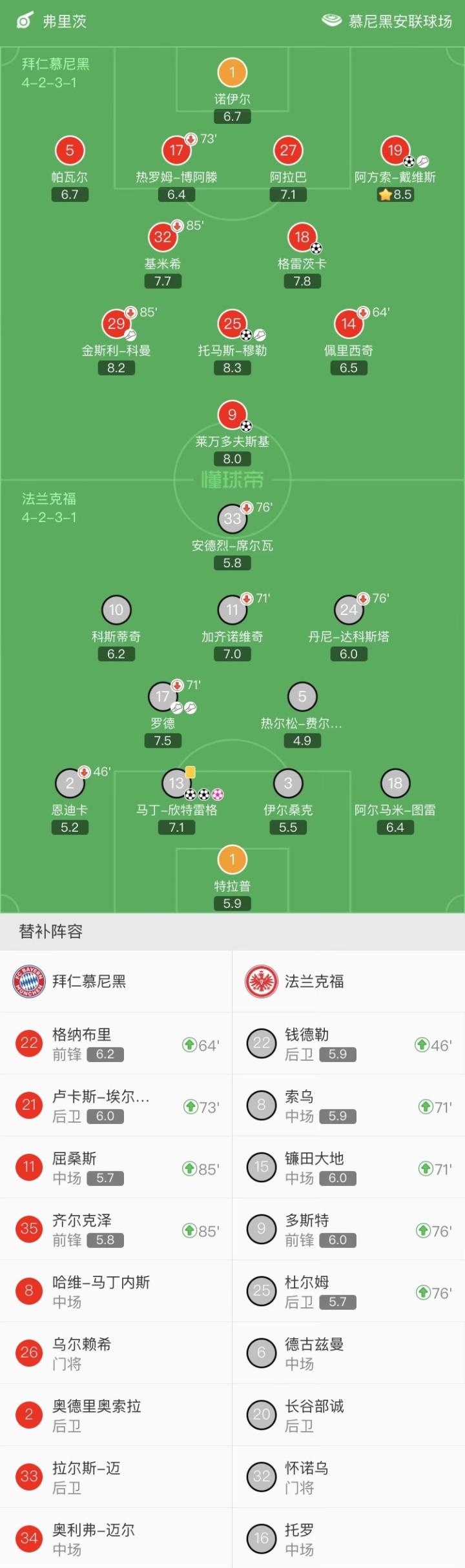 拜仁慕尼黑首发:1-诺伊尔、5-帕瓦尔、27-阿拉巴、17-热罗姆-博阿滕(73'21-卢卡斯-埃尔南德斯)、19-阿方索-戴维斯、32-基米希(85'11-屈桑斯)、29-科曼(85'35-齐尔克泽)、18-格雷茨卡、25-托马斯-穆勒、14-佩里西奇(64'22-格纳布里)、9-莱万多夫斯基