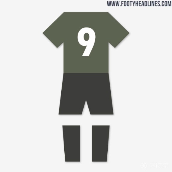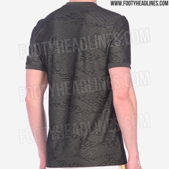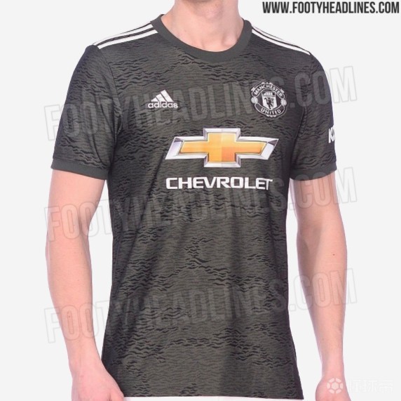 知名球衣网站footy headlines公开了2020-21赛季曼联的客场球衣图片,虽然实物图看上去是黑色,但是根据概念图,球衣实物更接近墨绿色。