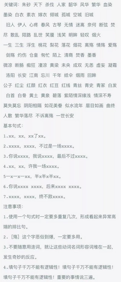 这些词的作者,显然是看到方文山老师文凭不高,许嵩也不过是个医科大出身,既然他们能把古典诗词化用到歌里走红,那么自己也指定不差。不,他们何止是不差,如果方文山老师的意象拼贴是后现代,那么他们就要做后后现代,后后后现代,从根基上破坏掉汉语逻辑。