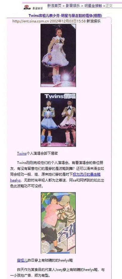 Twins在当年一场演唱会上,就曾“动用过”暴走鞋,两个女孩在舞台上滑来滑去如同会轻功一般,让无数年轻人为之着迷。