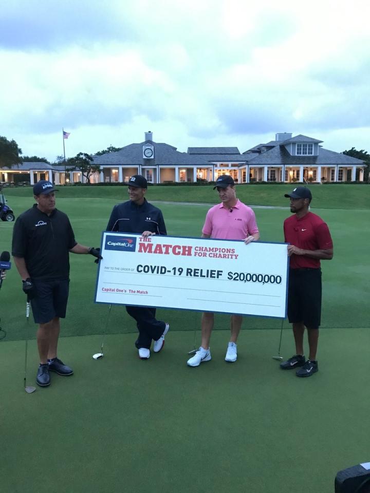 这场高尔夫慈善赛由华纳主办,为抗击新冠筹款。参赛的四人除了泰格-伍兹和菲尔-米克尔森是职业高尔夫球手,汤姆-布雷迪和佩顿-曼宁都是橄榄球巨星。比赛地点在老虎伍兹的家乡佛罗里达,初始奖金1000万美元,还可通过完成任务不断增加,最终奖池金额超过了2000万美金。