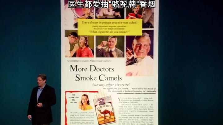 阿尔用40年前“医生都爱抽‘骆驼牌’香烟”的丑闻类比。图片来源:《难以忽视的真相》