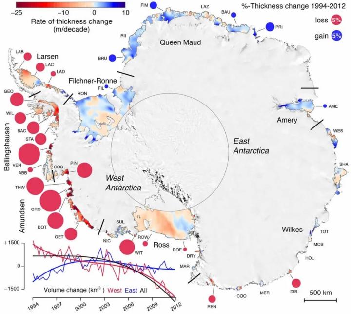 南极沿海冰架的厚度和体积变化(最近18年间)。左下角坐标图表示冰架体积的变化趋势,其中红线表示西部冰架,呈明显减少趋势;蓝线是东部冰架,稳定慢速减少趋势;黑线是整体趋势,表现为减少。图片来源:圣地亚哥加州大学斯克里普斯海洋学研究所