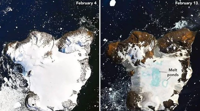 美国宇航局的卫星在2020年2月4日至13日拍下了鹰岛(南极西北端外的一个小岛) 的两幅图像,记录了南极大陆创纪录的高温时期。在这两个图像之间,该岛上大量的冰川消失了,露出了下面贫瘠的大片棕色岩石。图片来源:NASA Earth Observatory