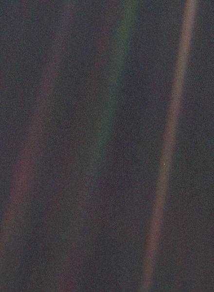 这张照片就是后世所传的“黯淡蓝点”( Pale Blue Dot)。照片中,地球如一粒闪光的微尘,漂浮在无垠太空中。