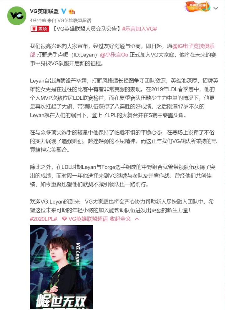 我们很高兴地向大家宣布,经过友好沟通与协商,即日起,原iG电子竞技俱乐部打野选手卢崛(ID:Leyan)正式加入VG大家庭,他将在未来的赛事中身披VG队服开启新的征程。