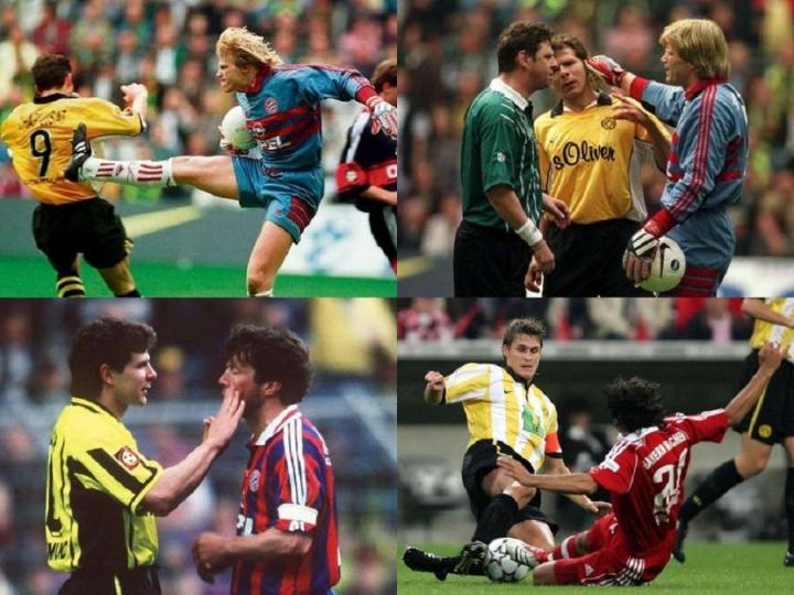 1999年4月,双方对决再度引爆赛场。比赛中,库福尔开局不久便因对鲁伊特犯规吃红牌下场,拜仁门将卡恩甚至遭到多特球迷抛撒香蕉。然而卡恩注定成为这场比赛的主角,他先是飞踹查普伊萨特,又趁海尔里希(奥格斯堡现任主帅)不备咬了多特前锋一口,此后他甚至当着裁判的面拧了穆勒耳朵。最后时刻,卡恩扑出里肯主罚的点球,力助拜仁2-2在客场全身而退。