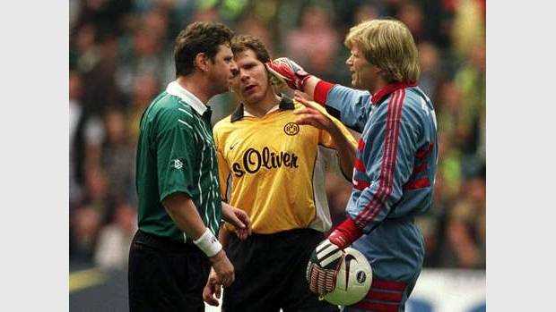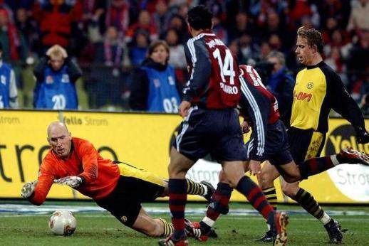 来到2002-03赛季第12轮,拜仁与多特再度强强相遇。扬-科勒第7分钟首开纪录,不过圣克鲁斯和皮萨罗的进球让拜仁反超。此后经典一幕发生了,多特门将莱曼因辱骂裁判而染红离场。由于多特已用完换人名额,不得不由202cm的科勒客串门将,却不想科勒居然在比赛最后20分钟力保城门不失!
