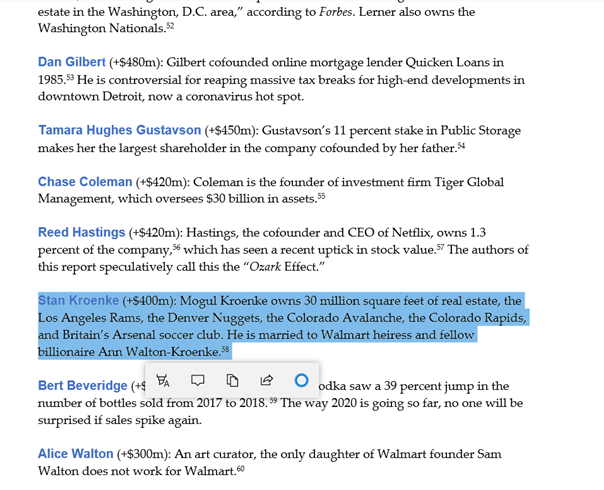 Institute for Policy Studies的报告分析截止日期是2020年4月23日,这天沃尔玛股市收盘价为128.53美元,2020年1月2日沃尔玛股市收盘价为118.94。沃尔玛总股本为28.34亿股。据此估算,这期间沃尔玛市值增加约272亿美元。克伦克占比2%,增加约为5.435亿美元。而公布的其个人财富增加值为4亿美元,也就是说克伦克在其他产业至少亏了1.435亿美元。(值得注意的是,最近沃尔玛股价又开始回落,不过仍然明显高于年初时的股价)。