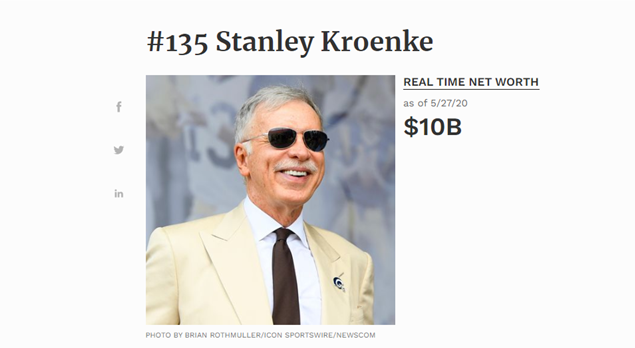 2020年开始的这几个月,很多公司遭受重创,很多人的收入也大幅下跌。风险往往与机遇并存,有人损失,就有人收获。4月时,美国研究机构Institute for Policy Studies公布了2020年富豪收入排行榜,列举了在疫情期间财富大增的富豪。其中有个球迷们,特别是枪迷们熟悉的名字——克伦克(Kroenke)。大家都知道克伦克是体育产业大亨,按理来说,疫情期间,各项体育赛事停摆,克伦克财富应该缩水才是,为什么反而挣钱了?