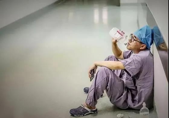 长时间工作的医生因为低血糖正在喝葡萄糖生理盐水,2016年