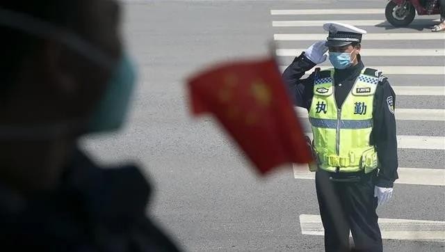 一名武汉警察向离开的协和医疗队敬礼,2020年