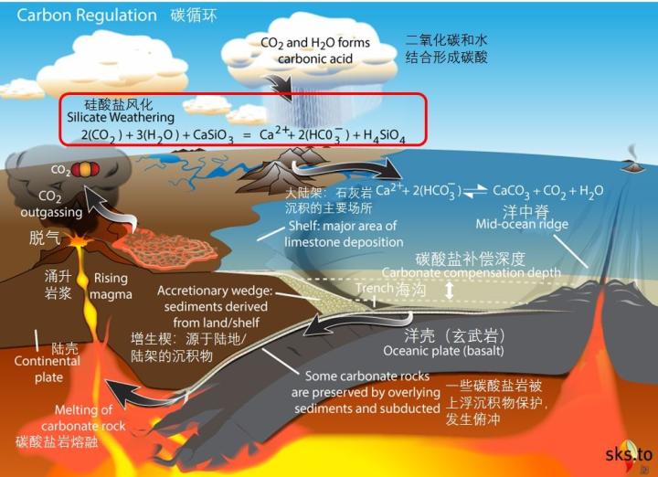 地质尺度的碳循环示意图 | 注意左上方硅酸盐风化吸收二氧化碳的原理。图源、译自@Skeptical Science