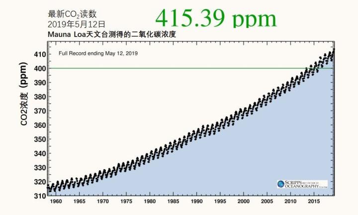 再创新高的二氧化碳浓度图 | 2019年初夏,美国夏威夷测得二氧化碳浓度超过415ppm(体积分数单位,指百万分之一),图源@Scripps Institution of Oceanography