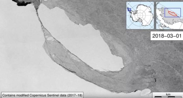 拉森C冰架破裂后的影像| 2018年3月时的拉森C(Larsen C)冰架和A-68冰山。图源@ESA