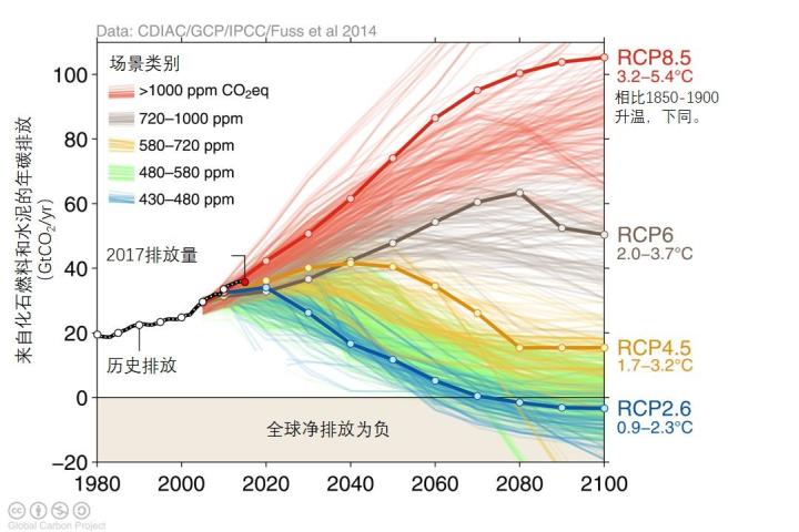 人类会选择哪一种未来? | RCP路径是根据不同碳排放量模拟的未来升温场景,大力减排实现负排放的RCP2.6路径是最理想的预期,本世纪末的全球升温不超过2.3℃;而无所作为的RCP8.5路径是最糟糕的预期,本世纪末的全球平均温度或升高3.2-5.4℃,译自[19]。水泥在生产和正常使用中,也会产生二氧化碳排放,是化石燃料之外比较重要的碳排放源。