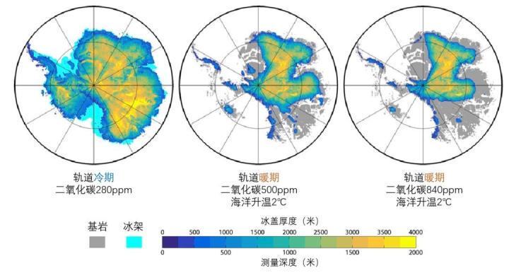 在距今约1400万年前的中新世气候温暖期,全球平均温度大约比现代高3-4℃,接近本世纪末碳排放失控场景下的最坏情况(RCP8.5)。有研究人员分别使用不同的地球轨道背景配以不同的二氧化碳浓度,对当时南极冰盖的情况进行了计算机模拟,发现当二氧化碳浓度达到500ppm时,冰盖将大幅离开海岸线;达到840ppm时,南极洲将出现大范围岩石裸露[20]。