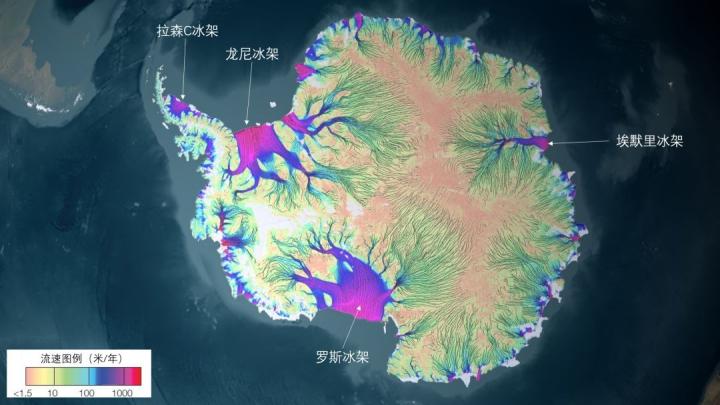 南极冰盖流动速率可视化效果 | 图中示意了南极一些主要冰架的位置及它们与陆上冰盖流动的关系。图源@NASA,有改动