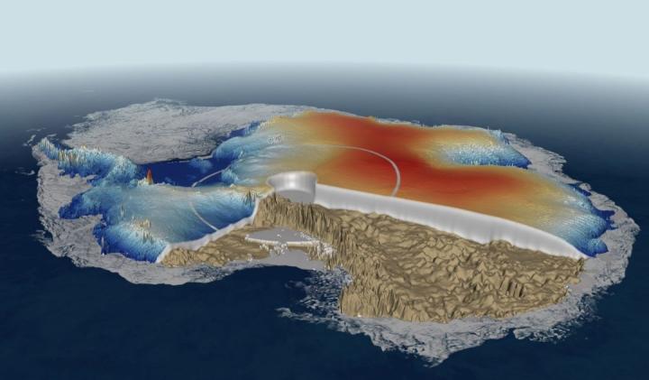 南极冰盖及冰下基岩的三维可视化图 | 南极冰盖平均厚度1829米,最大可达4700米,厚重的冰层之下隐藏了许多未知。图源@ESA