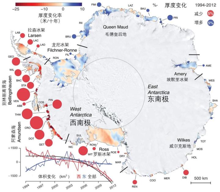 南极沿海冰架的厚度和体积变化(最近18年间)| 左下角坐标图表示冰架体积的变化趋势,其中红线表示西部冰架,呈明显减少趋势;蓝线是东部冰架,稳定慢速减少趋势;黑线是整体趋势,表现为减少,译自[14]。