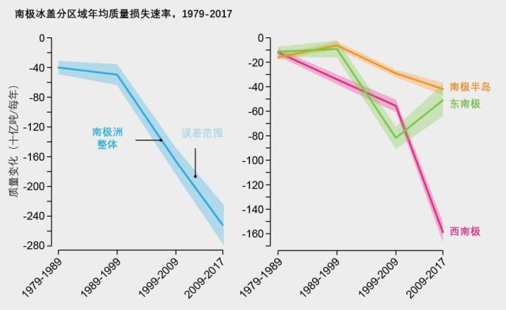 南极不同区域的冰盖平均质量损失速率折线图 |时间范围为1979-2017年,数据源自[17],图片译自@科学美国人。