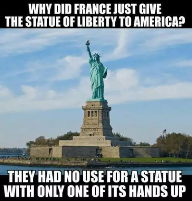 (图)为什么法国将自由女神像送给美国,因为自由女神像是单手上举,投降可是双手啊,这很不法国