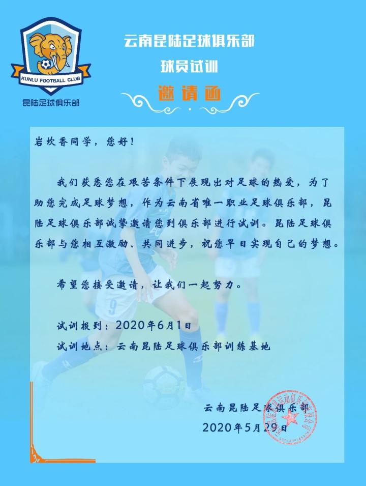 昆陆足球俱乐部已向岩坎香同学发出试训邀请函