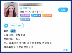 虽然人们常说“眼缘”很重要,但在游戏陪玩平台上,“声音缘”才是最重要的。陪玩师可以提供声音样本在个人主页上供人试听,毕竟“老板”与陪玩师之前是通过声音联系,声音是否符合自己喜好,也直接影响到服务质量。