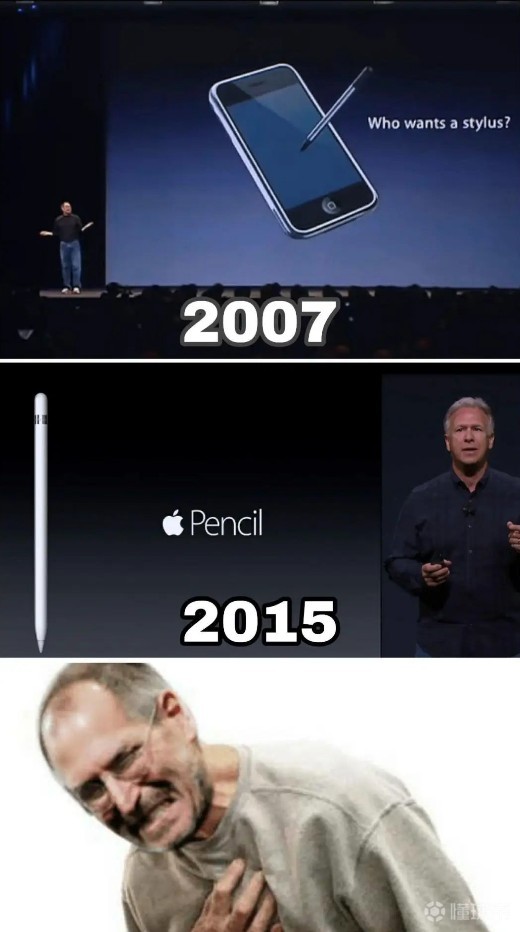 一次是手写笔的问题。如果你还记得 2007 年初代 iPhone 的发布会,当时乔布斯就有过一个戏谑触控笔的片段: