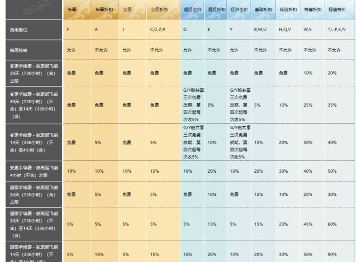 首先是舱位:你一定知道头等舱、商务舱、经济舱。这个叫做仓等,不叫舱位。在每个仓等里,才分出若干“舱位”。例如,头等舱大概分为:F、A;商务舱大概分为:C、D、J;经济舱大概分为:Y、B、K、H、L、M、Q、X、E。每个舱位对应着不同的机票折扣,也对应着不同的退改签规则。
