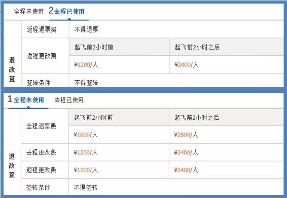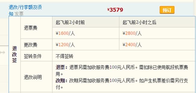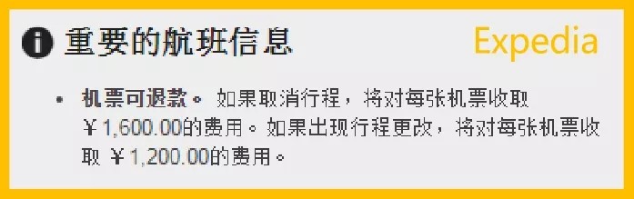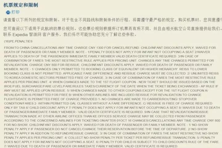 这是 Expedia 和携程对于同一张机票的查询。Expedia 只给出了两个信息:退票和改签费用。