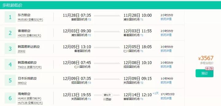我选了一个六程机票,北京-上海-香港-首尔-东京-大阪-北京。总共3567元。。。