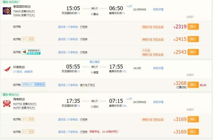 你可以掏出手机试一下,在携程机票页面里随便输入两个地方,例如北京-旧金山。你可以看到,系统推荐的是在达拉斯中转的美国航空航班,这个价格是实时最优的。往下翻你就会找到省时间但是贵一点的直飞航班。