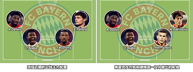 (图)聚勒和卢卡斯-埃尔南德斯先后受伤,弗里克排出由边后卫撑起的防线,用来执行压迫和控球战术,这是防线技术化、中卫轻量化的一种极端形式。
