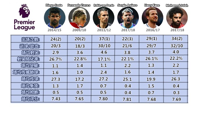 (图)英超"神锋"巅峰赛季数据对比。