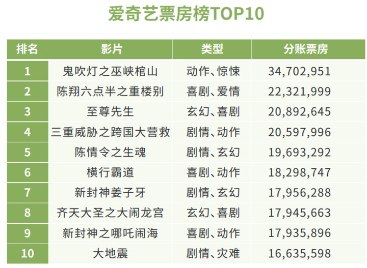 2019 年爱奇艺网络电影票房榜 TOP 10 ,数据来源:爱奇艺 2019 年网络电影行业报告