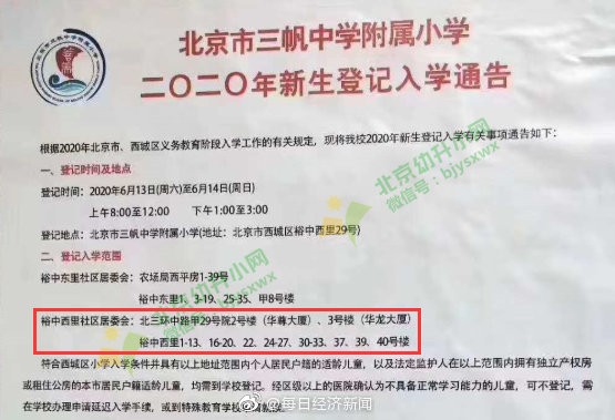 据每日经济新闻报道,因一纸招生简章,北京西城的中介们又迎来了一场狂欢。5月29日,北京市三帆中学附属小学发布2020年入学通告,其入学范围今年新增2栋楼——北三环中路甲29号院2号楼华尊大厦、3号楼华龙大厦。