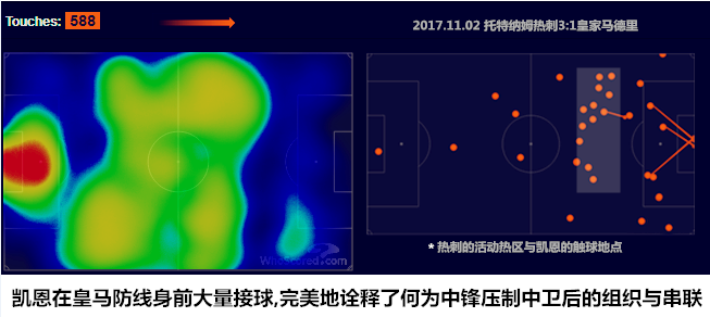 热刺的球衣除了赋予凯恩荣誉和名气外,给他带来更多的是压力和鞭策。近两个赛季,热刺的中场控制能力愈发虚弱,凯恩已经进化成了一个披着中锋外衣的二前锋/前腰,回撤中场疏导球路成为他的主要工作。曾经球风洒脱的伦敦少年,经过岁月的洗礼已经变成了集体至上、甘愿牺牲的团队型球员。通过大范围跑动来为队友拉开空间,背身接应后场来球后为队友铺路搭桥,突前压制中卫来制造进攻纵深,凯恩就是热刺队不可或缺的进攻柱石。